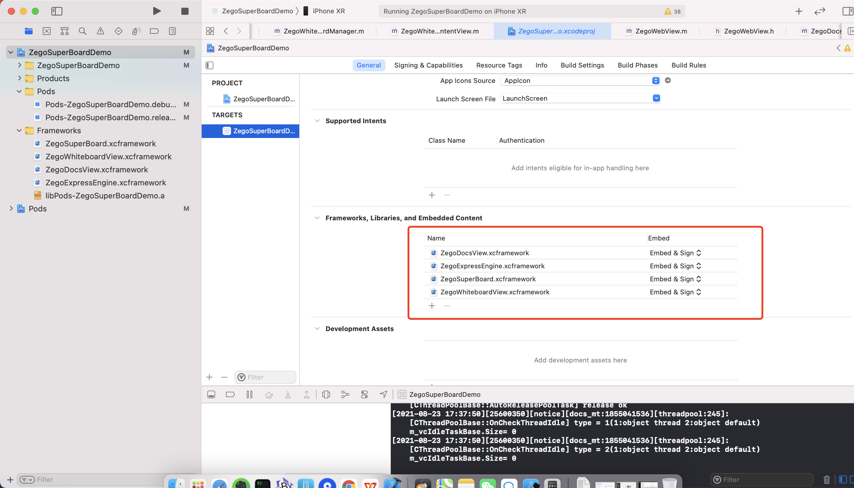 在 Xcode 中选择 “TARGETS > General > Frameworks,Libraries,and Enbedded Content” 菜单,添加 “ZegoSuperBoard.xcframework”、“ZegoWhiteboardView.xcframework”、“ZegoDocsView.xcframework” 和 “ZegoExpressEngine.xcframework”,将 “Embed” 设置为 “Embed & Sign”。