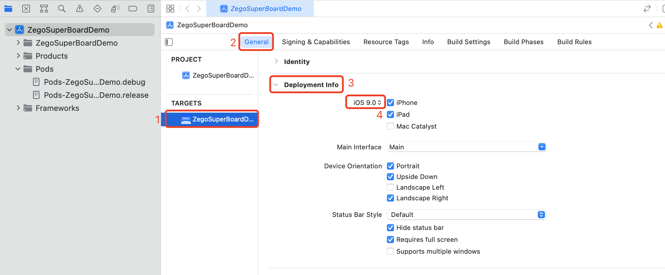 选择 “TARGET > General > Deployment Info”,设置 9.0 或以上版本。