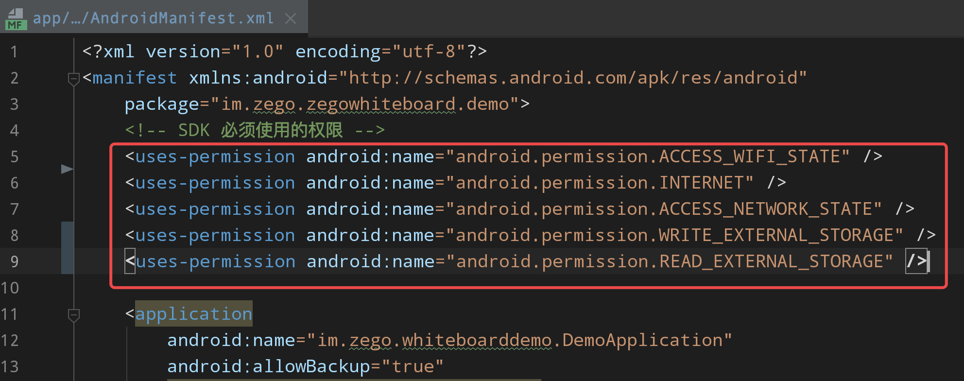 | ACCESS_WIFI_STATE | 必要权限 | 获取当前 WIFI 状态权限 | SDK 会根据网络状态的改变执行不同的操作。如当网络重连的时候,SDK 内部会将网络断开时的状态都恢复,用户不需做额外的操作。 |