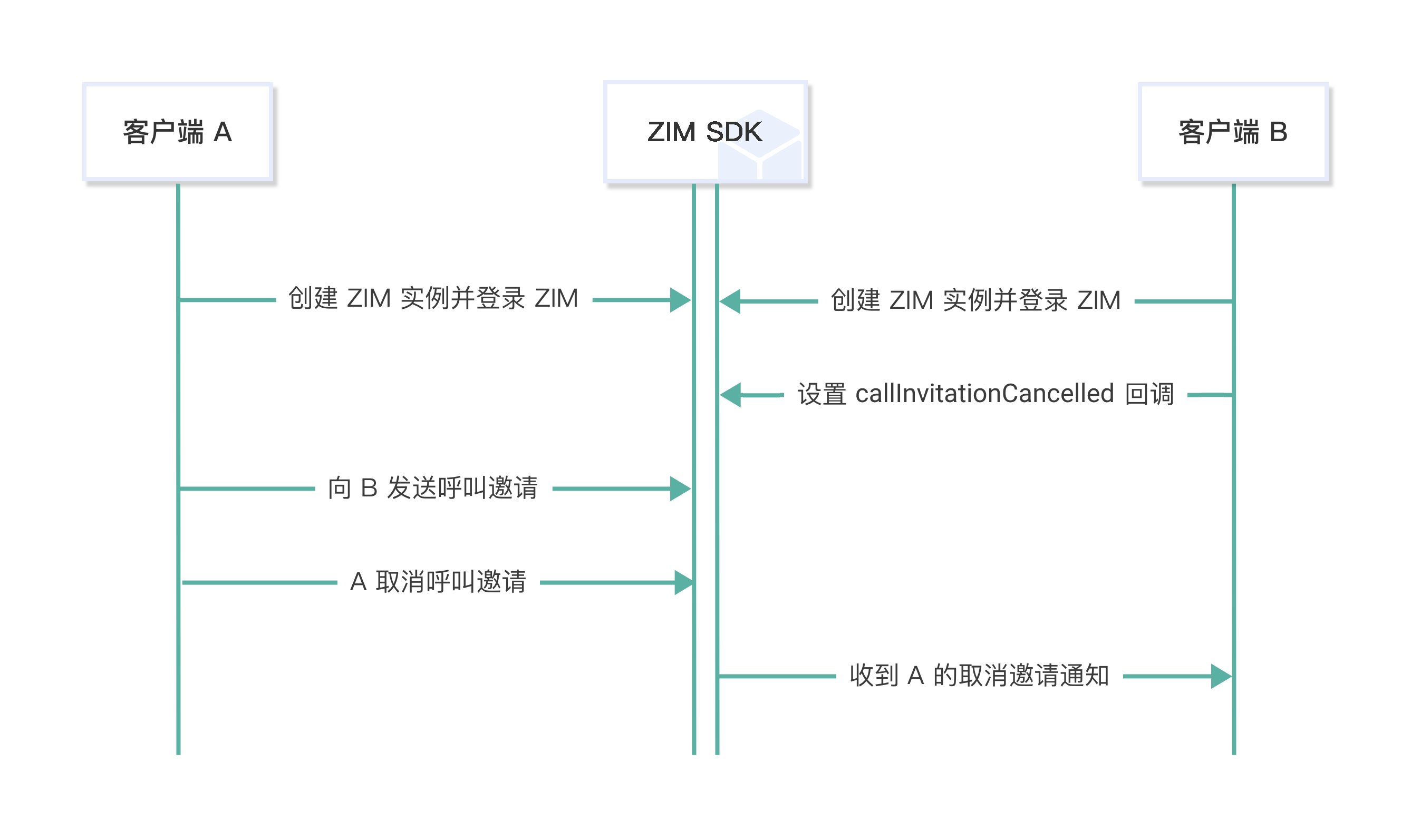 客户端 A 向客户端 B 发起呼叫邀请后、又取消邀请时,流程如下: