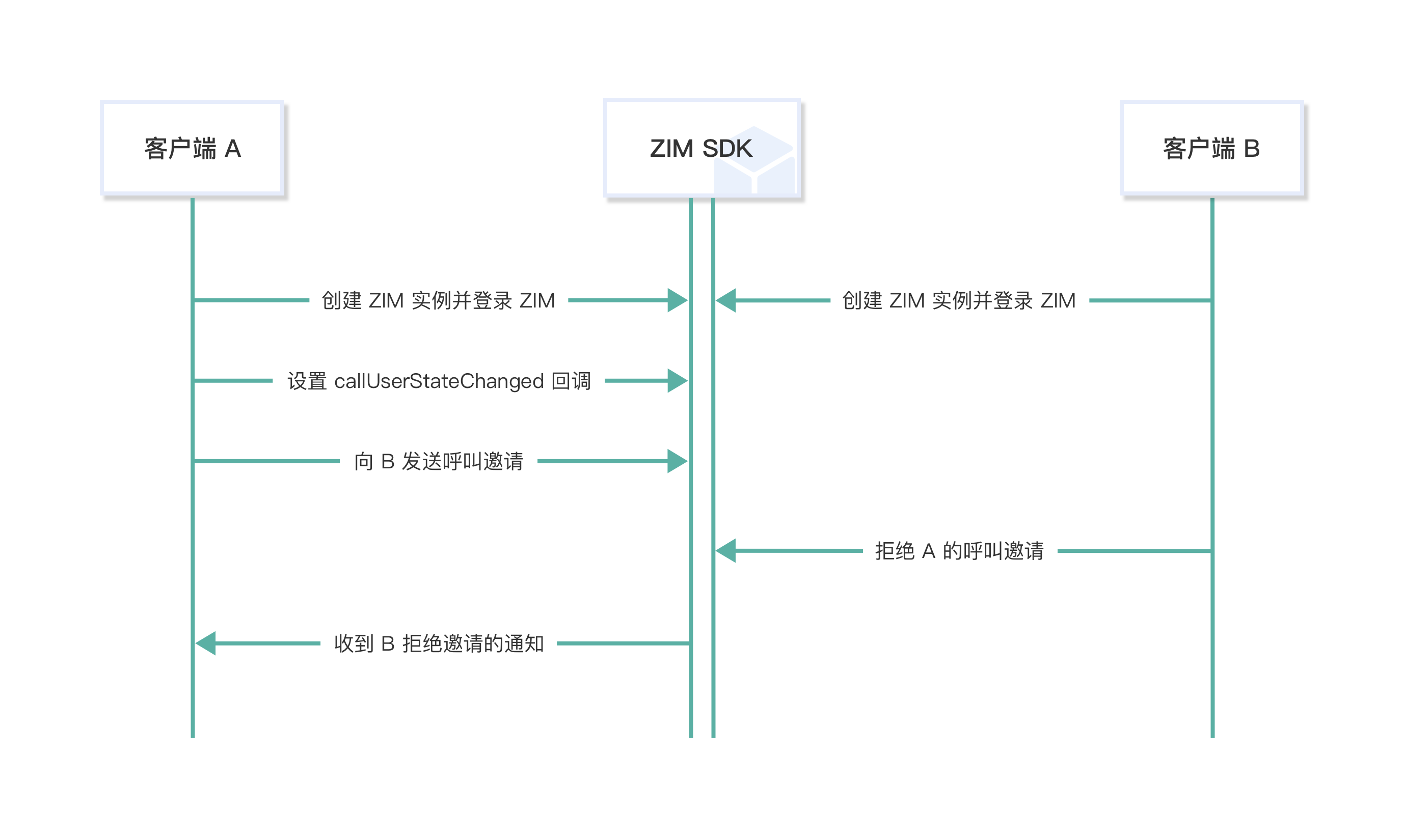 客户端 B 收到客户端 A 的呼叫邀请后,选择拒绝邀请时,流程如下: