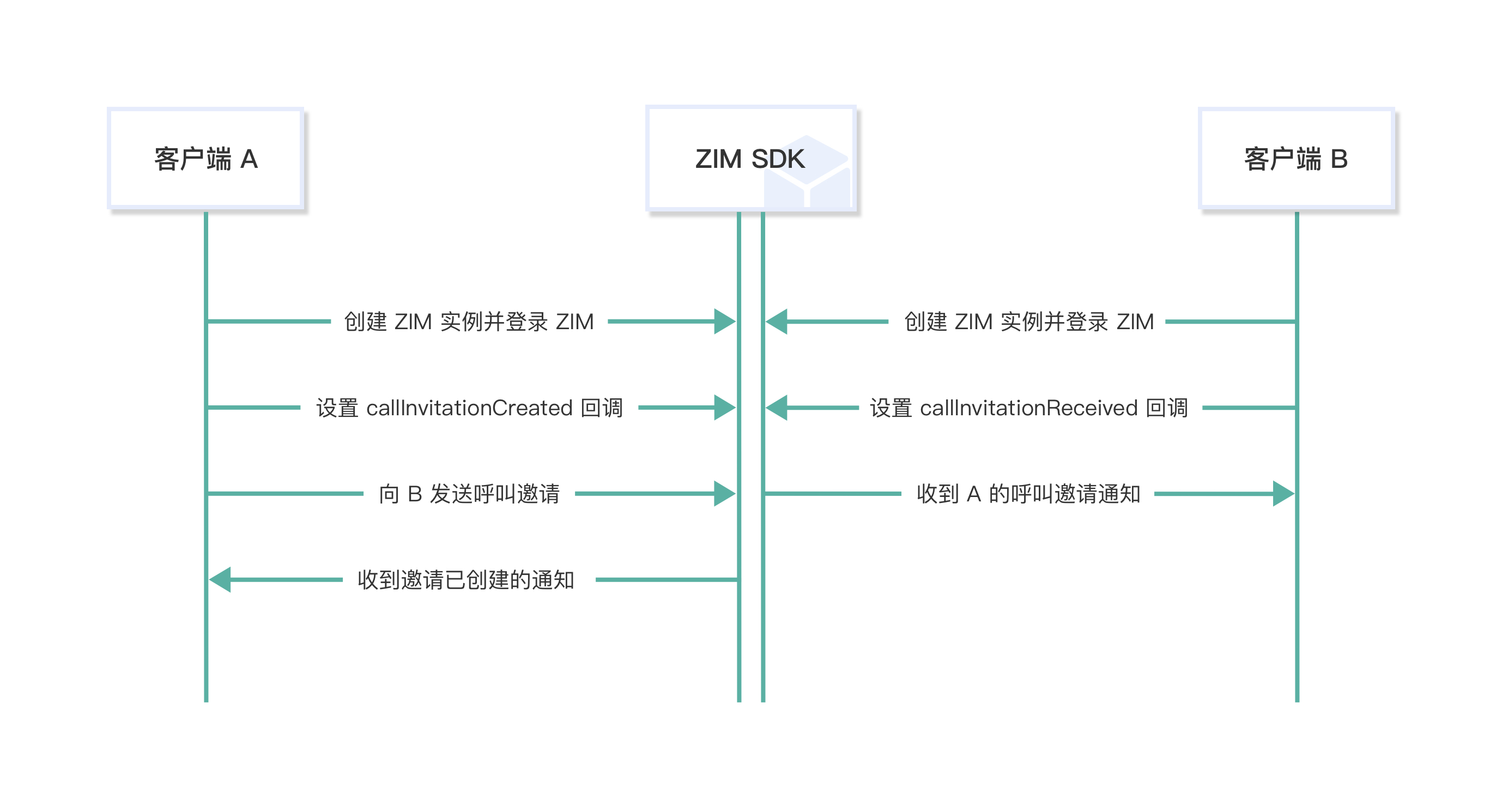 客户端 A 向客户端 B 发起呼叫邀请时,流程如下: