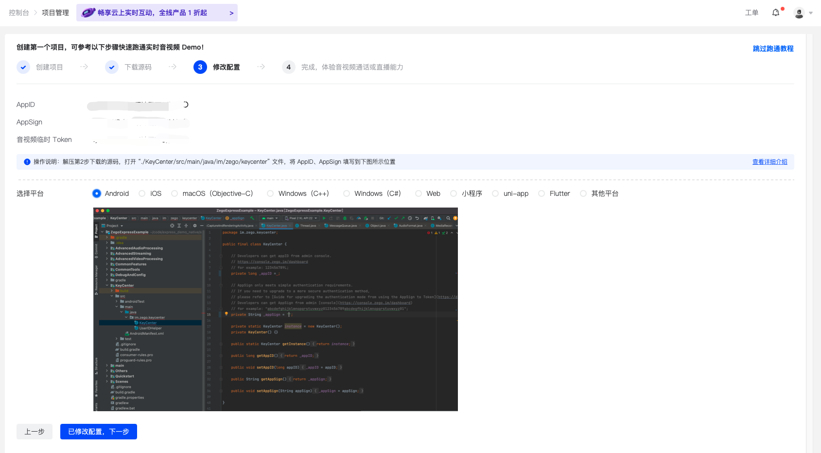 解压步骤二下载的源码。示例源码中缺少 SDK 初始化所需的 “AppID”、“AppSign” 和 “Token”等配置信息,可以从本界面获取。根据“操作说明”,找到示例源码的对应文件,将相关配置信息填写到对应位置即可。