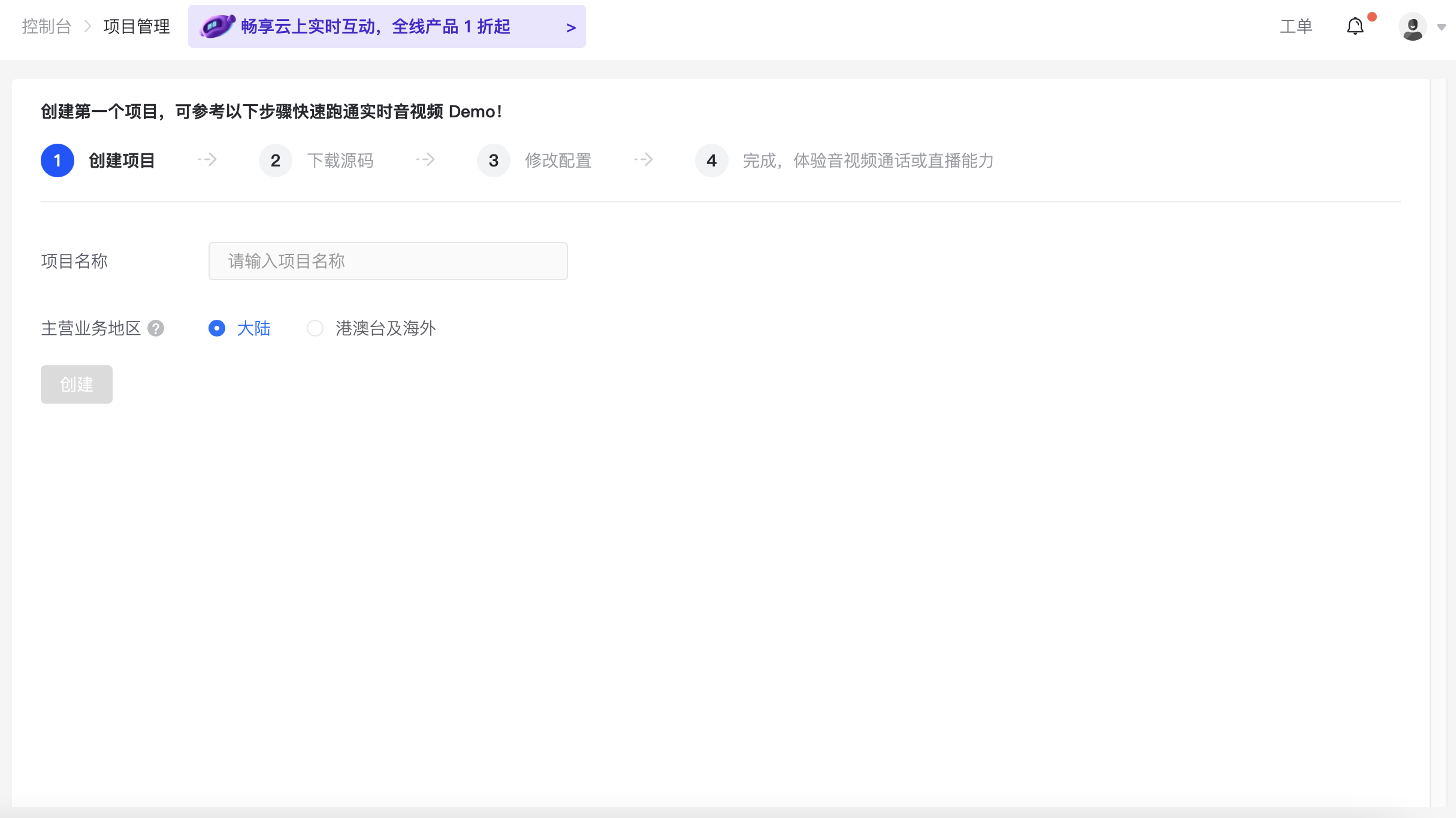 输入项目名称,选择主营业务地区,完成后点击“创建”进入下一步。