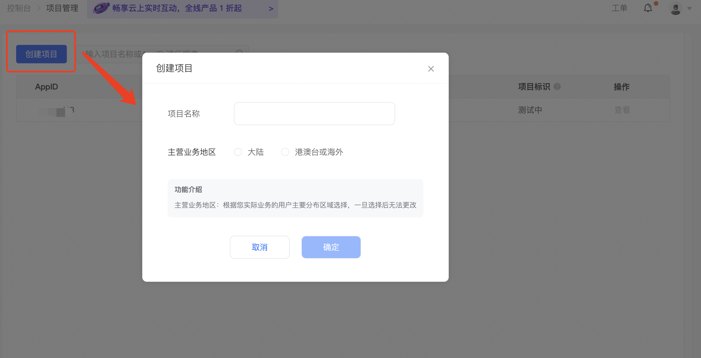 点击“创建项目”,在弹出的“创建项目”窗口中,填写“项目名称”、并按需选择“主营业务地区”。