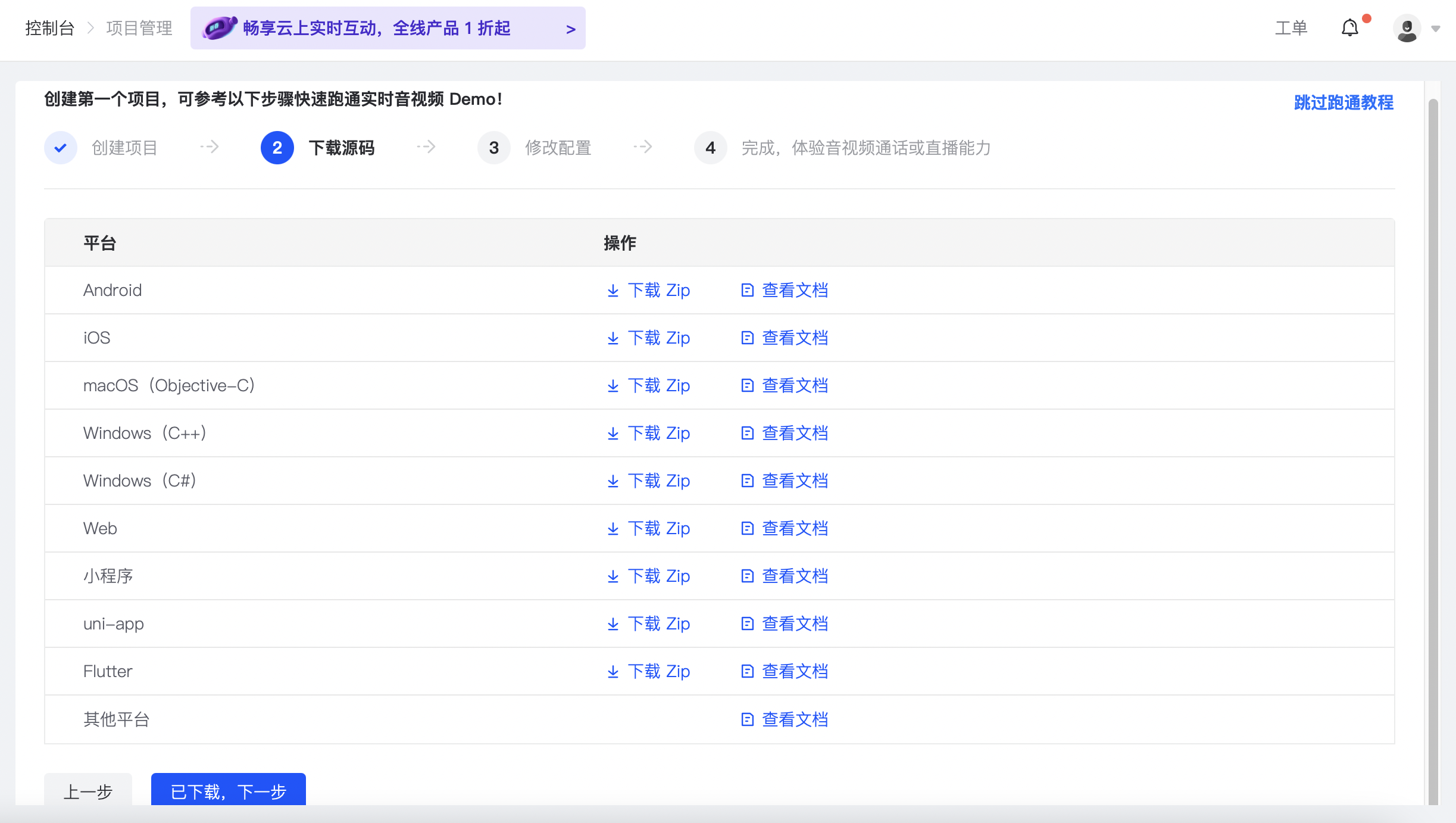 如果是首次创建项目,您可以按照教程快速跑通实时音视频源码。