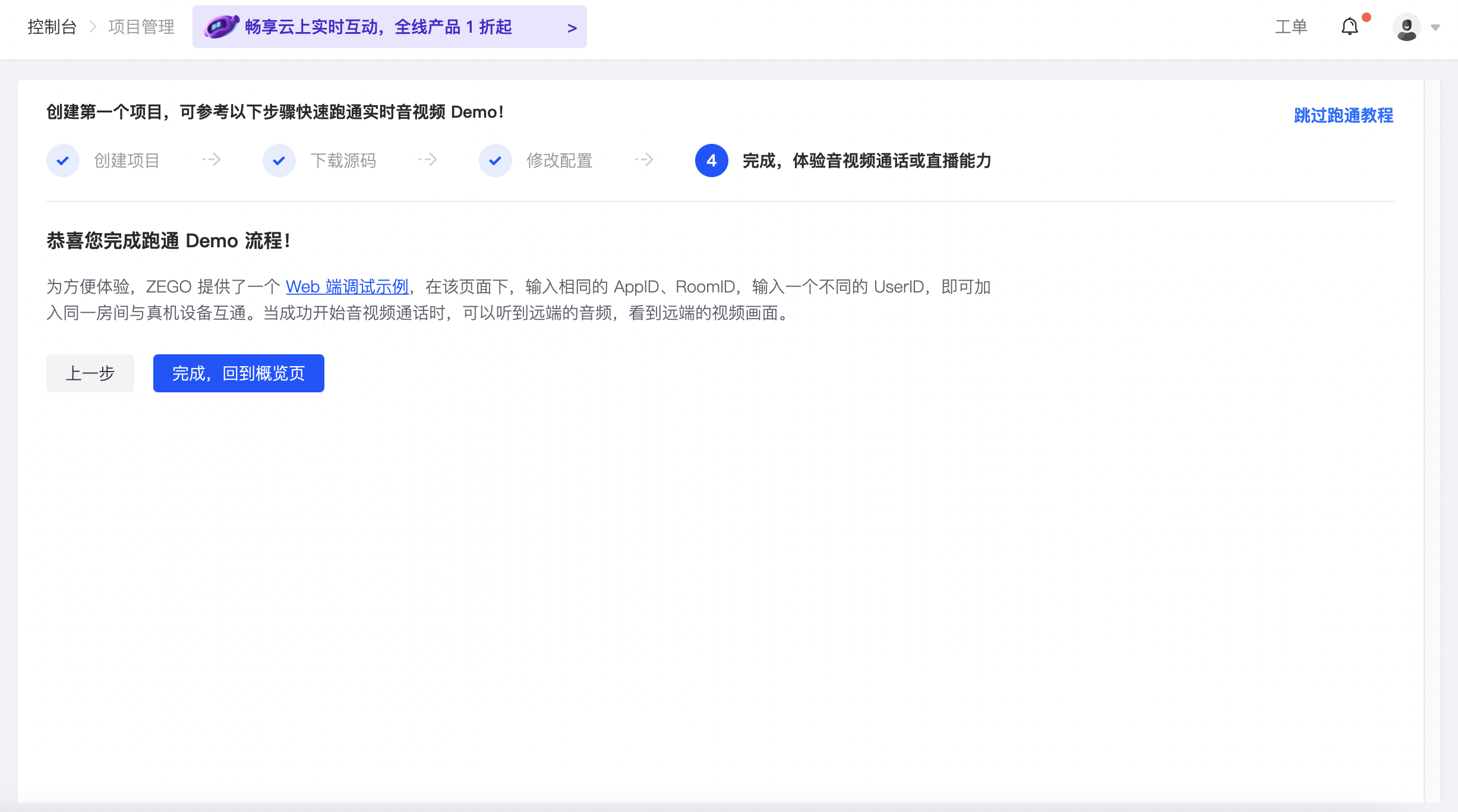 为方便体验,ZEGO 提供了一个 Web 端调试示例。