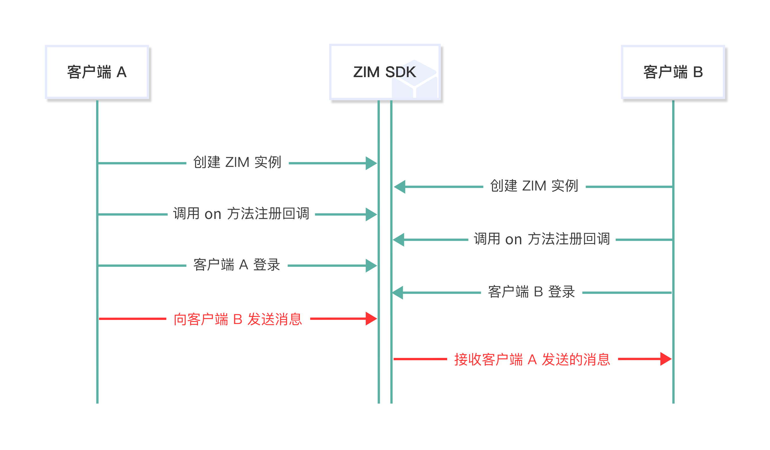 type(具体请参考 ZIMMessageType)字段,判断消息类型是 Text 还是 Command,然后强转基类为具体的子类(ZIMTextMessage 或 ZIMCommandMessage),然后从 “message” 字段获取消息内容。以客户端 A 向客户端 B 发送消息为例: