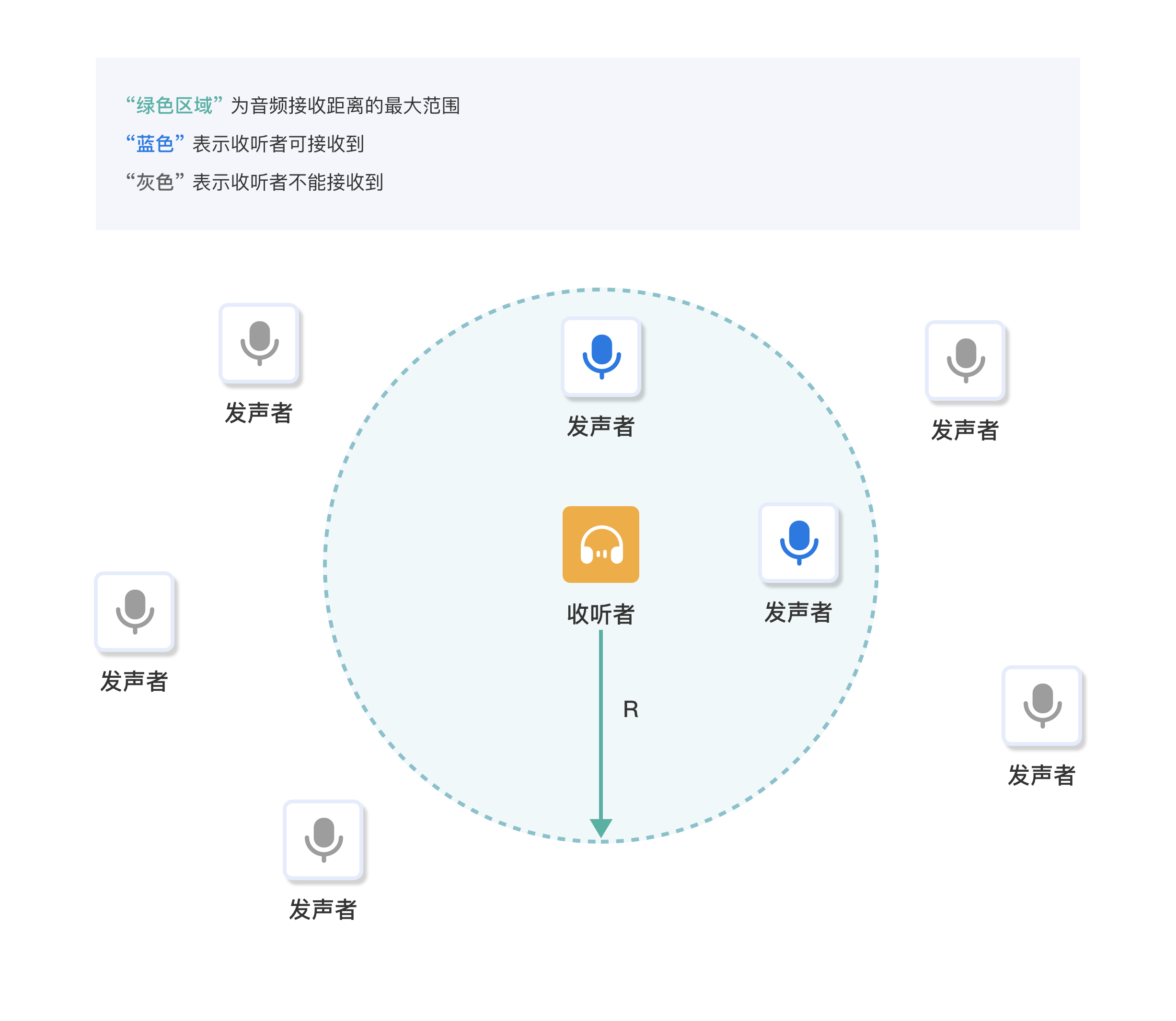 房间内的收听者对音频的接收距离有范围限制,若发声者与自己的距离超过该范围,则无法听到声音。为保证语音清晰,附近超过 20 人发声时,只能听到离自己最近的 20 个发声者的声音。
