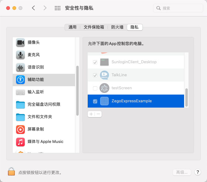 macOS 调用屏幕共享接口在 macOS 平台会获取相关权限,需要在 “安全性与隐私” 中开启录屏权限与辅助功能权限,如不生效需要将之前的权限删除再次新增。