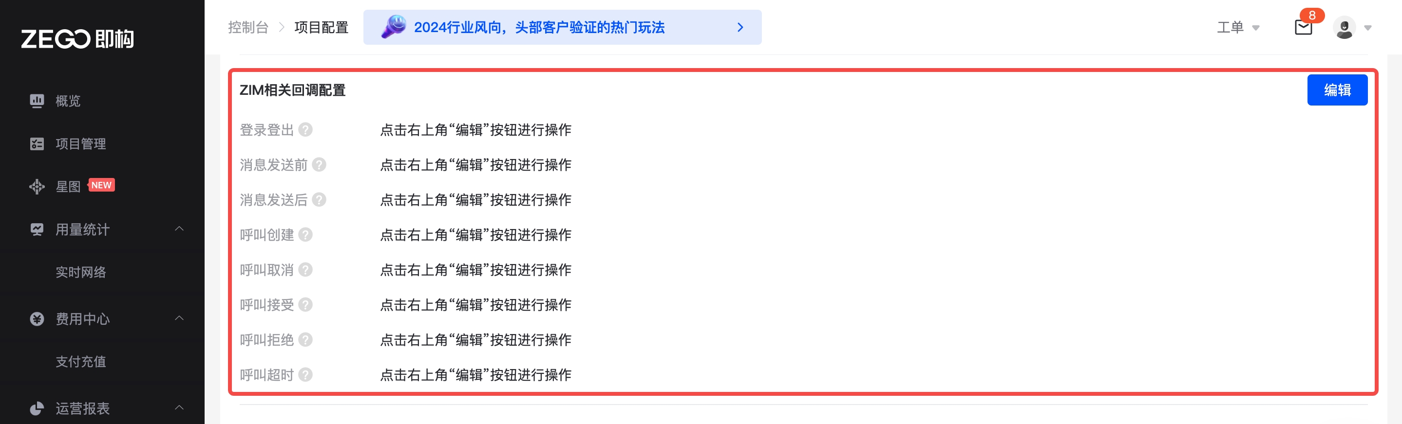在“ZIM相关回调配置”模块,点击“编辑”即可添加回调地址。