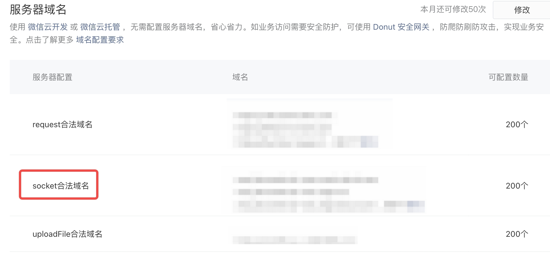 2023-09-20 起至 2024-09-20 止,ZEGO 不再接受对 3.0.0 以前版本的微信小程序 SDK 的功能新增申请,仅支持问题修复、提供安全补丁。2024-09-20 后,ZEGO 将停止对 3.0.0 以前版本的微信小程序 SDK 的维护,不再接受功能新增、问题修复、安全补丁等各种申请。打开 微信公众平台,扫码进入 “小程序管理平台”,选择菜单 “开发管理 > 开发设置 > 服务器域名 > socket服务器域名”,进入修改页面,添加以下 socket 合法服务器域名: