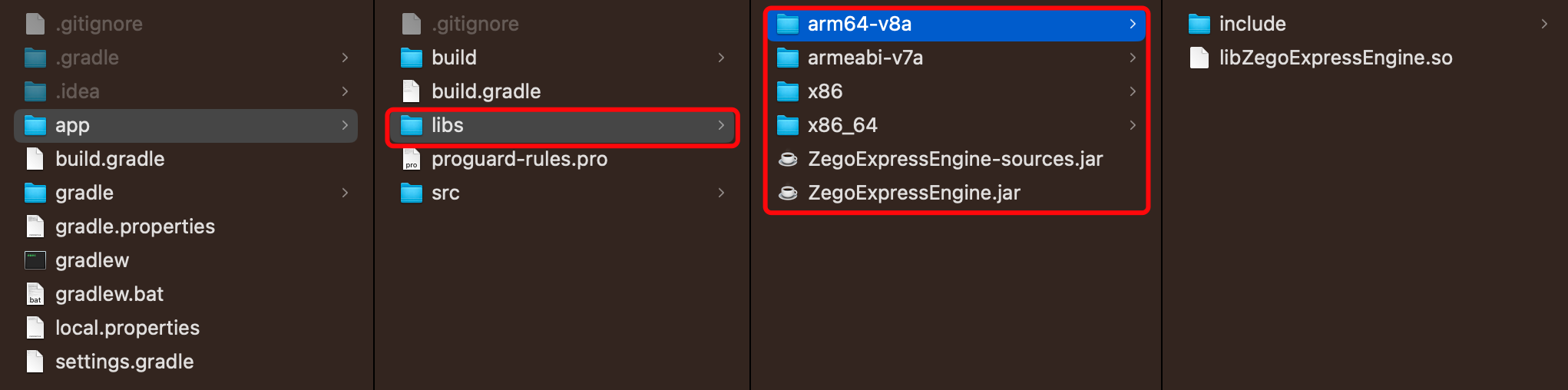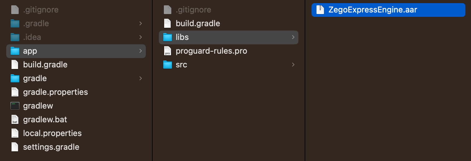 将解压后的 AAR 文件中的 “release/Library/ZegoExpressEngine.aar” 文件拷贝至您的项目目录下,如 “app/libs”。
