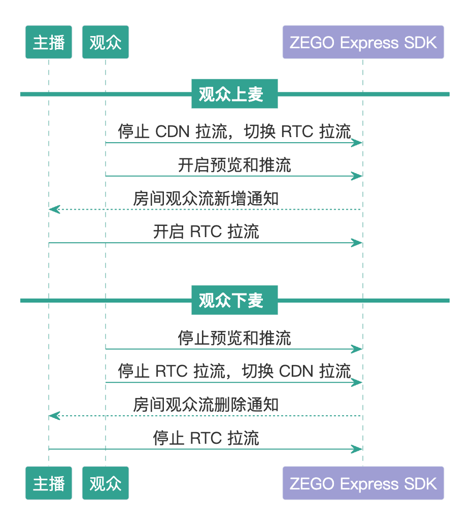 当从 CDN 拉流切换到连麦场景时,观众端需调用 stopPlayingStream 停止当前 CDN 拉流,并调用 startPlayingStream 切换为 RTC 拉流。