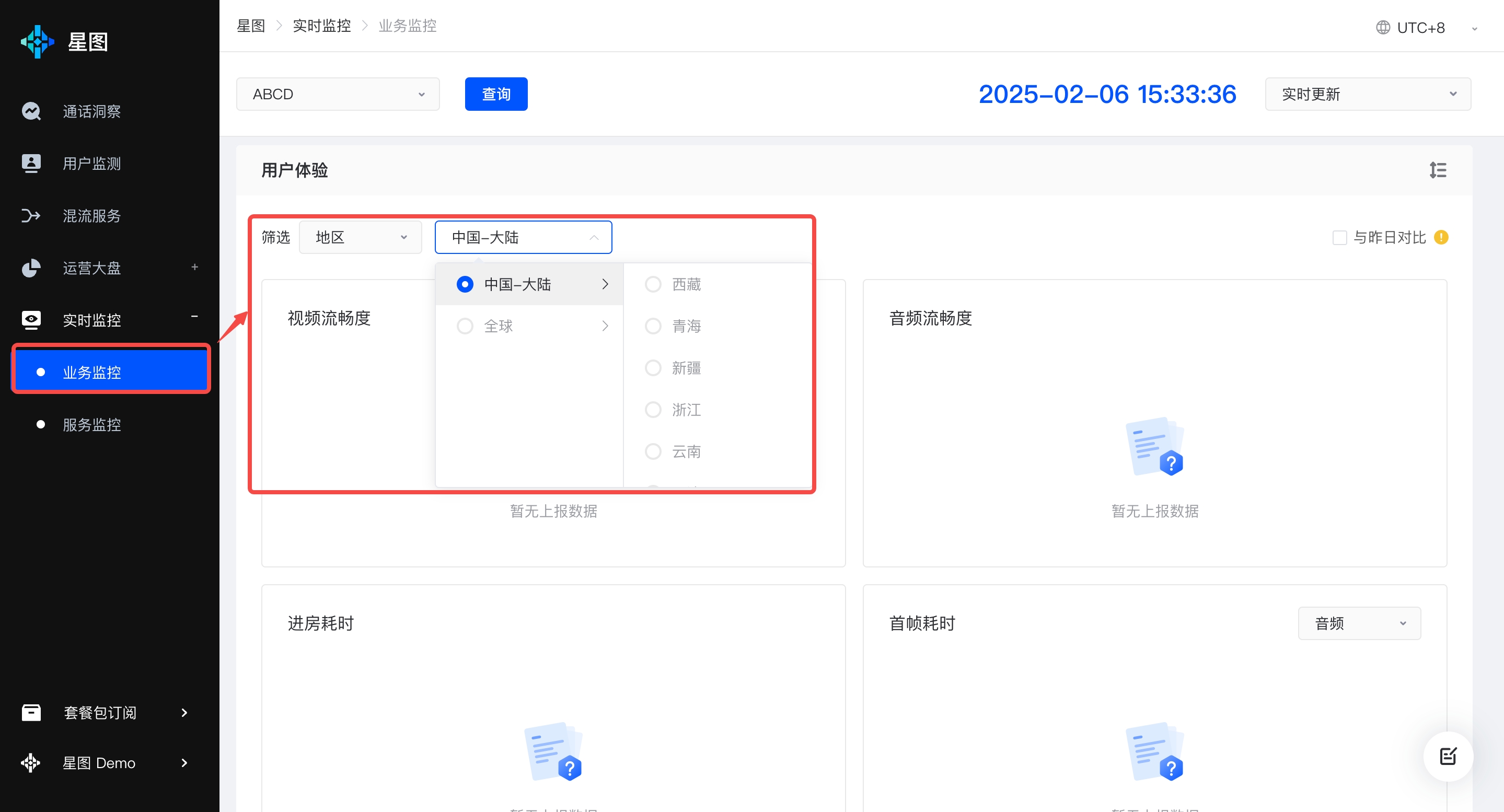 查询指定地区(或所有地区)和指定平台(或所有平台)上 1 小时内的质量数据。