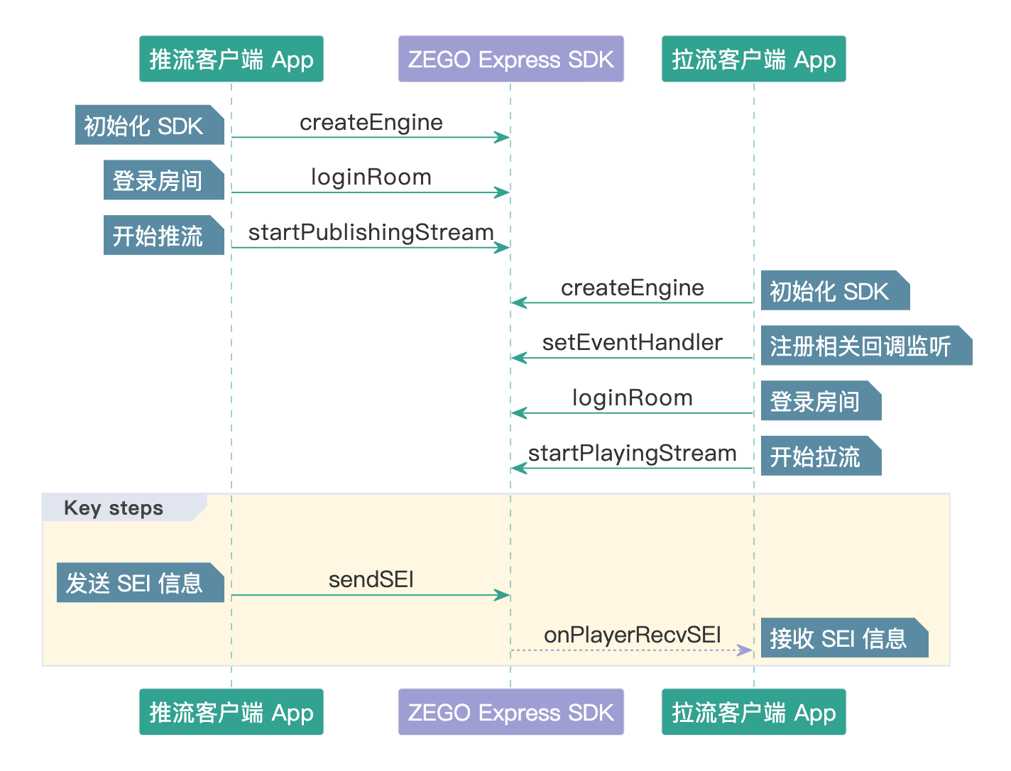 发送与接收 SEI 信息功能,需要在推流端发送 SEI 信息,在拉流端接收 SEI 信息,如下图所示: