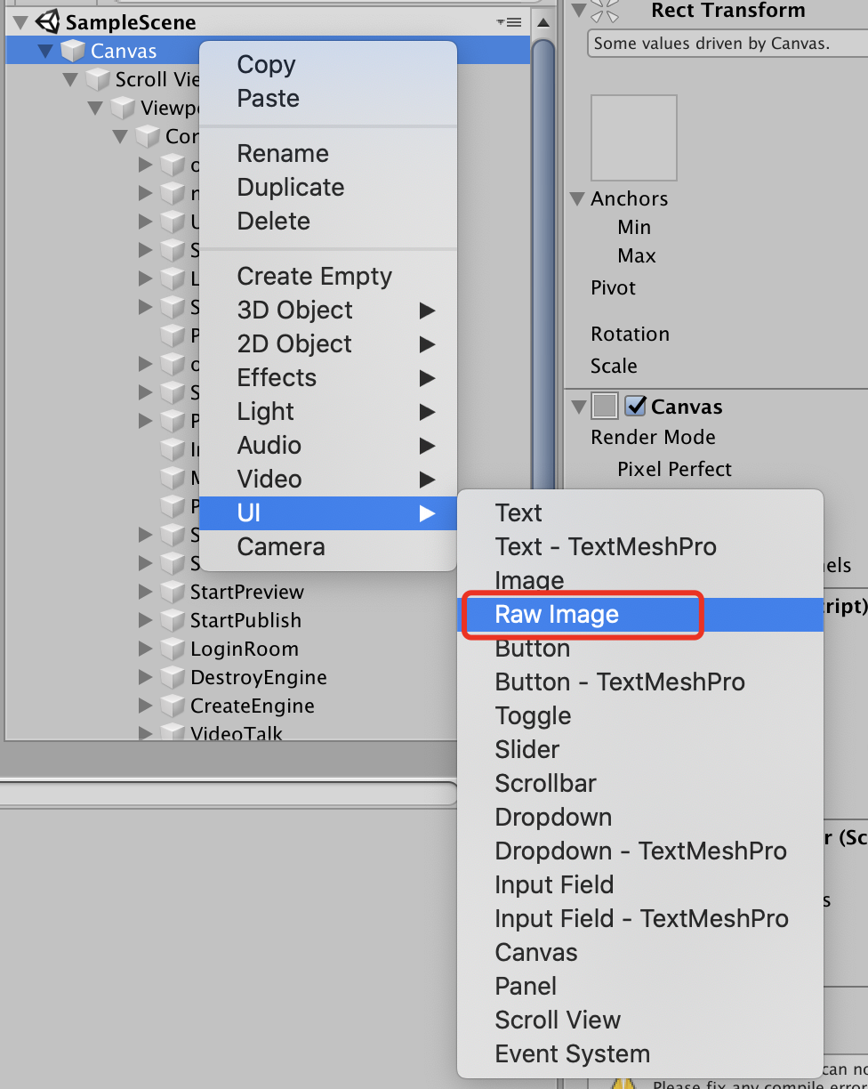 Unity3D 支持通过 RawImage 和 Renderer 两种渲染器进行拉流渲染。